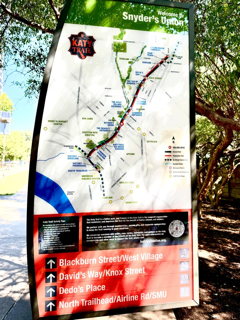 Discrete access points are located every 1/4 mile, so consult a map. Several restaurants back up to the trail, making them great stop-off or starting points. Following the trail from the south trailhead on Houston Street north to Airline Road is a great way to experience Victory Park, Harwood, Turtle Creek, Uptown, Knox-Henderson, and Highland Park.